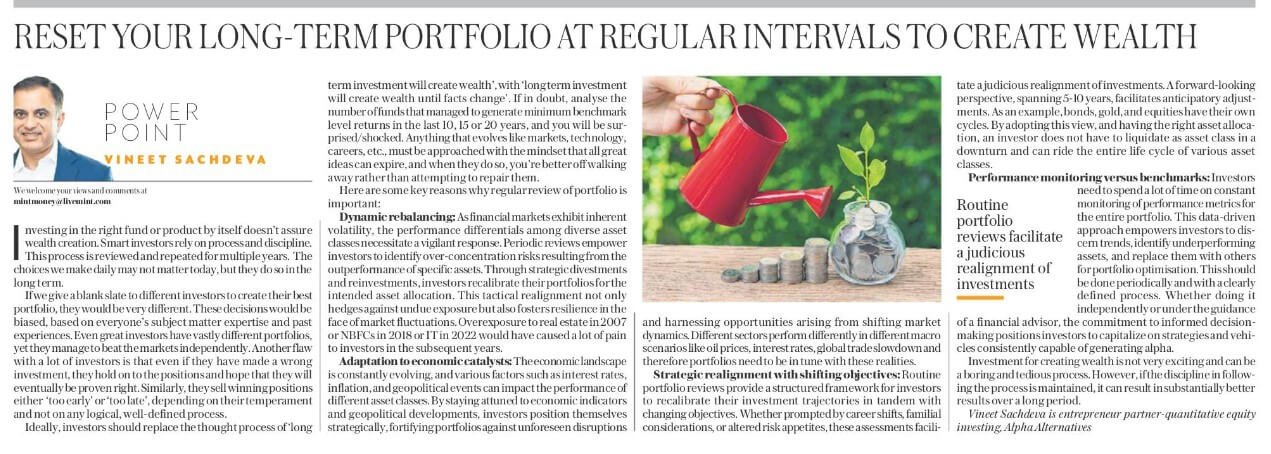 Investment for creating wealth is not very exciting and can be a boring and tedious process. However, if the discipline in following the process is maintained, it can result in substantially better results over a long period. Regular portfolio reviews, and diversification across assets and investment styles are essential for maintaining a healthy and balanced long-term portfolio. Actively managing your investments (including ETFs, MFs, PMS, AIFs etc) can help you create and preserve wealth over time.